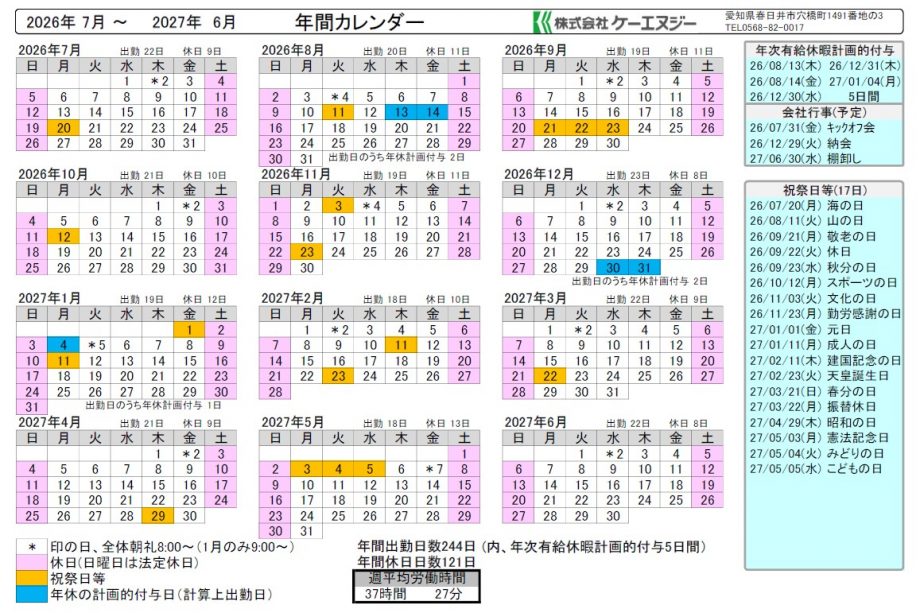 来期は2026年7月1日に始まりますが、祝日の関係上、年間休日121日+年次有給休暇の計画的付与5日を盆休みと年末年始に組み込み、合計で126日の休日となります。